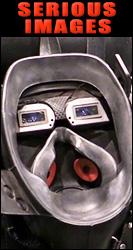 After the strap-in, Hawk & Rob remove my rubber hood so I see daylight for the first time in almost three days. The torture here is the immediate application of a leather face mask that does not even have breathing holes. I must quickly learn not to panic, and to breathe slowly and carefully. |