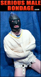 | As a final punishment, the guards returned me to Cell 4, where they stripped me out of my black rubber. I was very thankful for the release from the rubber, until Hawk and Rob immediately bent my legs and arms, then stuffed me into a rubber hogsack on the floor. I wailed in protest yet again, and NoEscapeSlave hollered at the guards from the adjacent cell about my mistreatment. Of course, none of this had any effect. After the cell door clanged shut, the guards left me writhing in my torment with only one tiny breathing hole at my mouth. I had finally paid the price for my attempt to escape. These videos can be seen on SeriousMaleBondage.com. Check it out! |