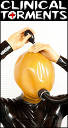 2009 photo of JG-Leathers in his Creature. Bondage, rubber, gas masks, e-stim and suction pumps are added to take the subject on a ride of maximum stimulation. |