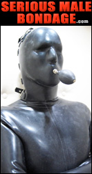 2009 photo of JG-Leathers in his Creature. Bondage, rubber, gas masks, e-stim and suction pumps are added to take the subject on a ride of maximum stimulation. |