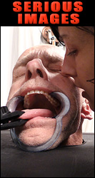 Naturally, Yossie's prisoner is required to hold their wrist, ankle or neck down and close to the anvil while he hammers over the ends of the rivets. But Yossie says that's half the fun! The hammer and anvil ritual is an important part of being shackled, and while Yossie is pounding away his guest can fantasize about medieval dungeons, chain gangs or blacksmiths. By the way, the folded black-and-white cloth in the photo below is a striped jail suit from PX Direct. Yossie mentioned the importance of having his prisoner put the jail suit on before hammering the rivets closed, although he's having another jail suit suit made with velcro seams so it can be easily removed for washing and bathing. What a great idea! |
