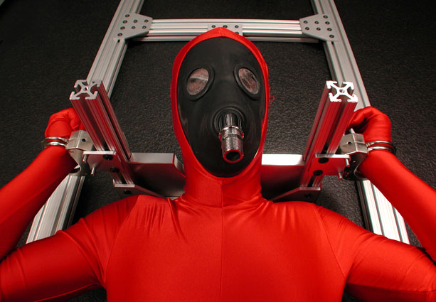 | As any serious bondage enthusiast will tell you, there's a point during a bondage session when your brain yells out "Uh oh! I think this bondage is pretty solid and inescapable!" This was the case as Bekah closed the second Clejuso cuff and I began to feel the rigidity of the massive 80/20 frame surrounding me. There was no play or give whatsoever. |