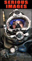 | Through the porthole openings of the hood I could survey my helpless situation. My hands were so close yet so useless, held firm within the grasp of the rigid Clejuso cuffs. As I turned my head the  re-breather bag seemed to squirm and tumble about freely as if to say "ha ha, you can't reach me!" |