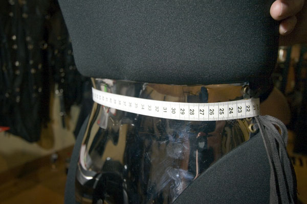The following photos show Latowski (in the orange robe) measuring customers and visiting with the Mister-S staff. He used two special chastity belts for taking the measurements, which incorporated side laces for adjustability.