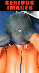 The result of giving someone pleasure and release while they are in bondage gear, of this magnitude and complexity, is that they will (hopefully) develop a fetish attraction to the gear and the experience. All the components; i.e. the tight latex, the gas-mask, the pungent odor of the rubber, and the extreme helplessness all become quite attractive and sexually charged. Leta has discovered a new world. |