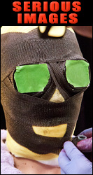 | Finally, they had secured me fully on the table. I was delighted to feel the full effect of the stringent bondage and the tight latex hood. |