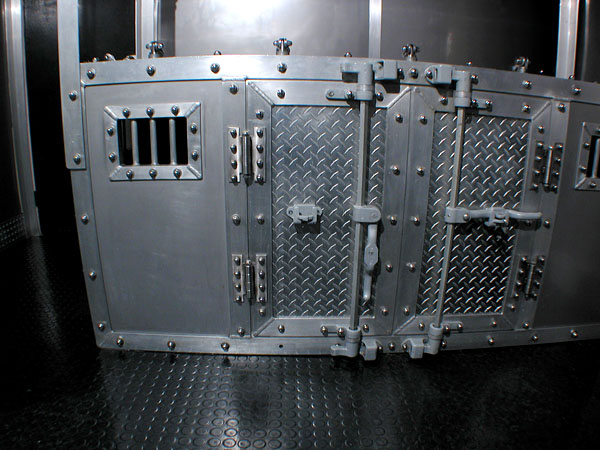 The Confinement Cell is made of welded aluminum with heavy stainless steel hinges and a very secure locking mechanism of the type that's used to close semi-truck trailer doors. |
